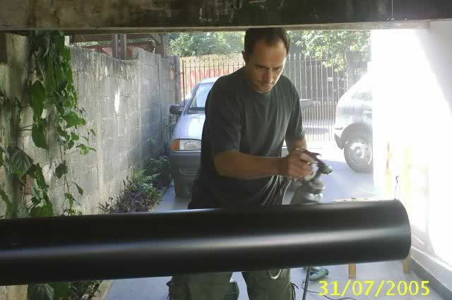 Felizmente eu tenho um amigo pintor de autos, o Jorge Raimundo, que fez essa parte para mim. A pintura do meu telescópio foi feita com pistola de pintura e compressor, mas tenho visto que a maioria dos construtores amadores usam tinta spray por não serem tão felizardos em ter um camarada pintor :-)