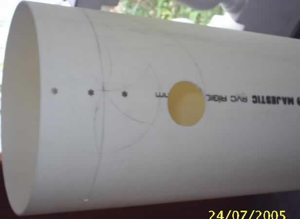 Vire o cano de boca pra baixo e marque quatro pontos eqüidistantes. Veja na sessão Preliminares a dica de como fazer um disco de cartolina e dividir em partes iguais
